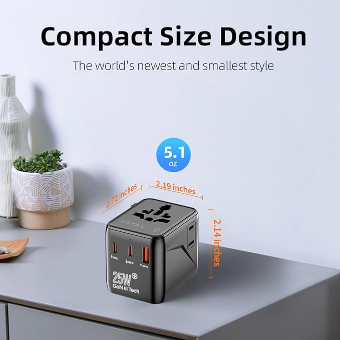 - FAST CHARGING ADAPTER FAST: Equipped with GaN III Tech, this 25W travel adapter provides fast and efficient charging for smartphones, tablets, and laptops. Designed as a versatile plug adapter, it also works as a travel adapter worldwide, an adapter plug UK, and one of the most reliable travel plugs for frequent travelers.